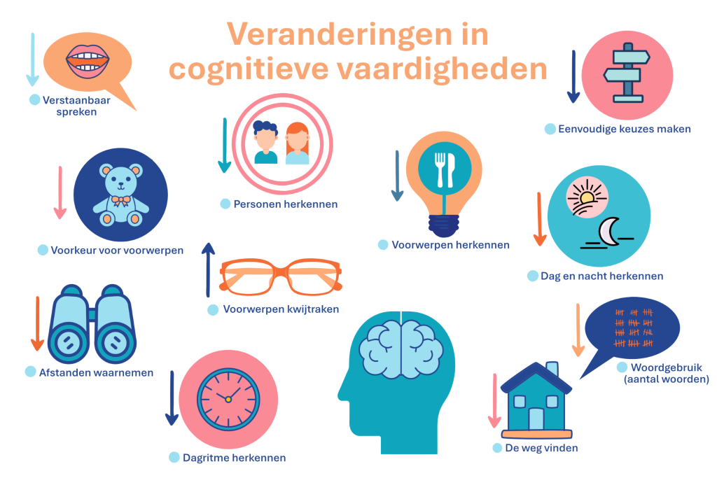 Er zijn ook cognitieve symptomen waarbij kunnen praten of lopen geen of een kleinere rol speelt. Ook bij mensen met (Z)EV(M)B en dementie die niet kunnen praten of lopen, merk je op den duur dat ze familieleden, begeleiders of voorwerpen niet meer herkennen of niet meer weten hoe je bepaalde voorwerpen (zoals een beker, vork of knuffel) gebruikt.