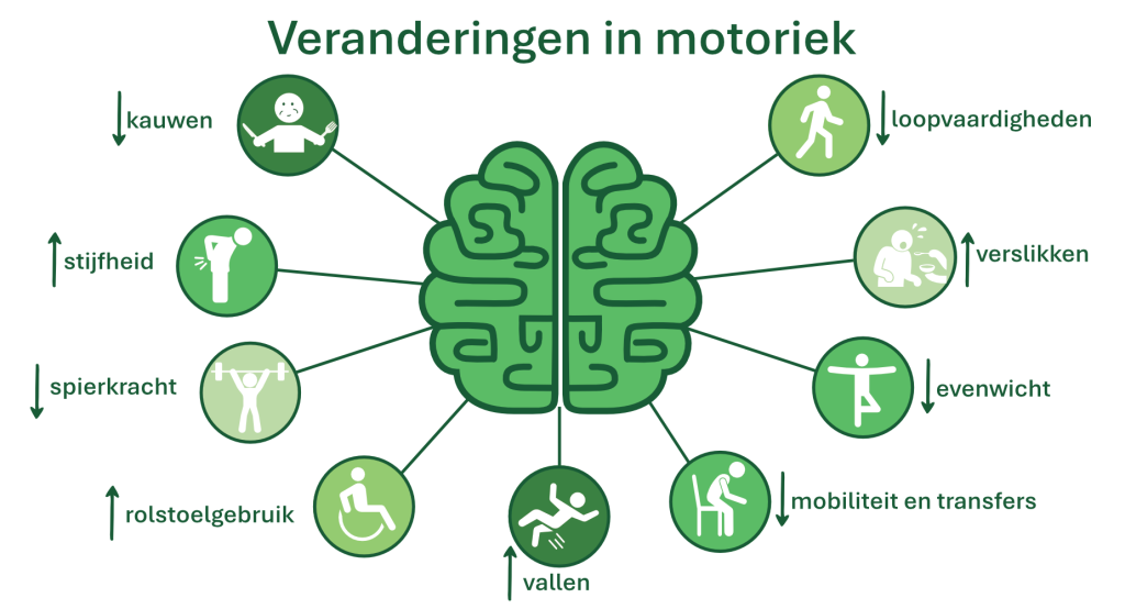 Een andere motorische verandering is dat iemand stijver wordt, waardoor hij of zij minder goed in en uit de (rol)stoel of het bed kan komen, meer moeite heeft om de arm in de mouw van een trui te steken en minder meebeweegt bij verzorgingsmomenten.